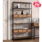 Estantería de inspiración Country con estructura metálica color negro y resto en madera de abeto acabado anogalado. Dispone de seis baldas, dos de ellas con cuerpo de dos cajones con tirador de anilla cada una.