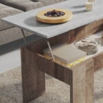 Mesa de centro elevable acabada en laminado sintético gris/roble.