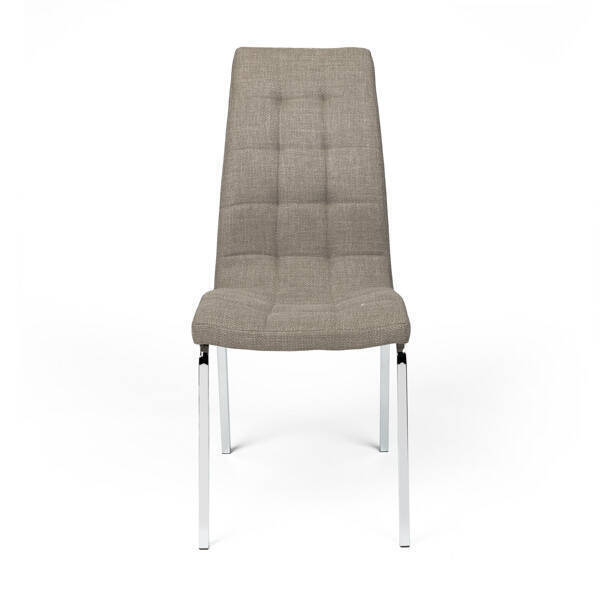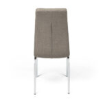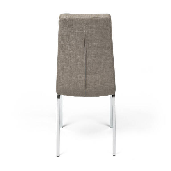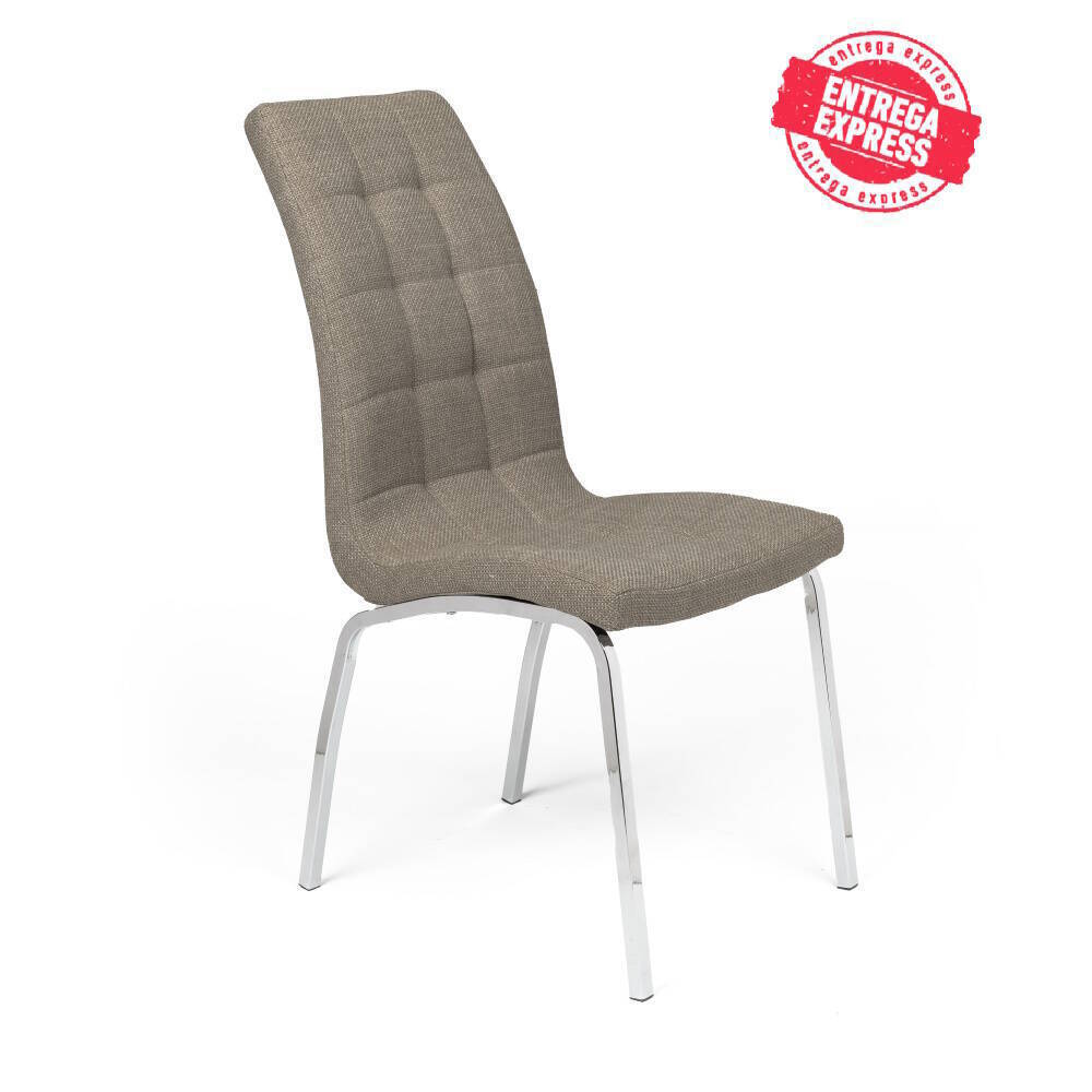 Silla tapizada en tela marrón con patas cromadas.  Asiento y respaldo ergonómicos y acolchados. También disponible en colores negro, blanco, chocolate y gris oscuro para polipiel y gris oscuro y rosa para tela.