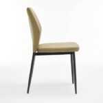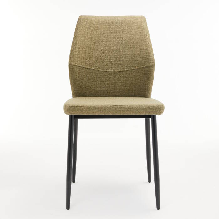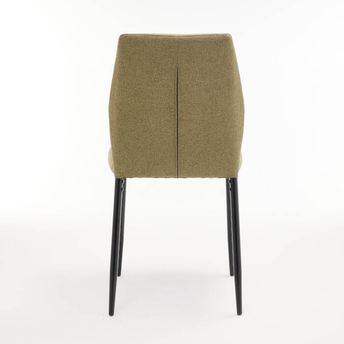 Silla tapizada en tela Easy Clean tipo lino color verde musgo, con asiento y respaldo acolchados, este último incluye costura decorativa en el frente. Patas metálicas en color negro. Se sirve en cajas de 4 unidades.
