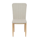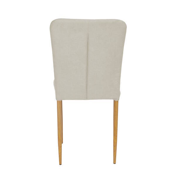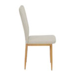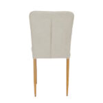 Silla fabricada en madera contrachapada con relleno de espuma y patas metálicas en acabado madera.  Disponible en color blanco o chocolate para el tapizado en símil piel, tela beig y gris perla para el tapizado en tela tipo velvet.
