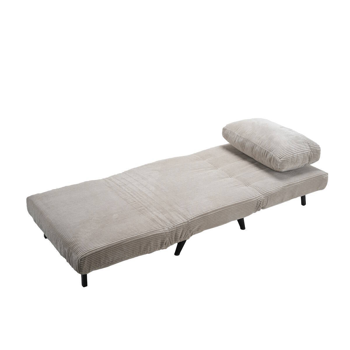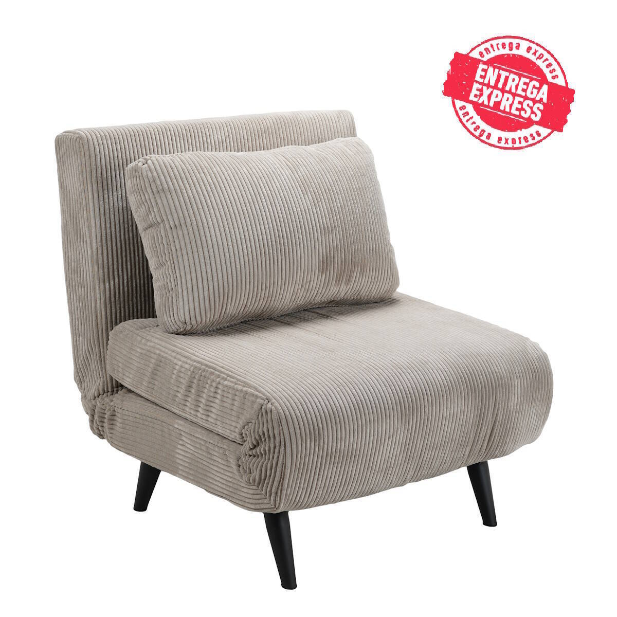 Sillón cama plegable con sistema de apertura clic clac, fabricado con espuma de alta densidad y tapizado en tela color beige, con patas metálicas color negro.